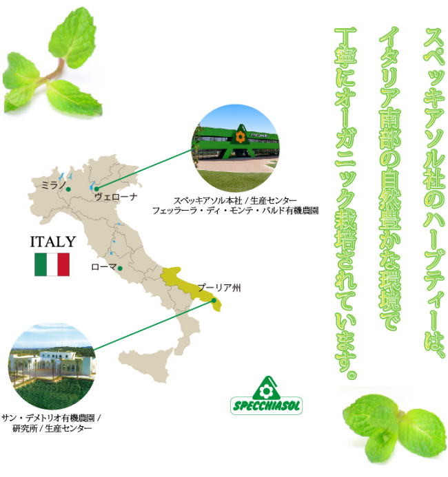 スペッキアソル社が所有する南イタリア・プーリア州のサン・デメトリオ有機農園は100ヘクタールの広大な農地で、ICEAのInspection and Certification(検査と認証)登録ECC2092/91の基準にしたがって作られました。地中海の気候にも恵まれ、現在ヨーロッパ最大規模を誇る有機農園です。この農園ではカモミール、カリフォルニア・ポピー(キンエイカ)、エキナセア、ラベンダー、ローズマリー、セージ、サボリー、マリーゴールド、ミントなどの植物を無農薬で栽培しています。 また、北イタリア・ヴェローナにはフェッラーラ・ディ・モンテ・バルド有機農園を所有し、緩やかな斜面の山の中腹での、薬草栽培には大変理想的な気候を生かして多種多様な薬草を栽培しています。